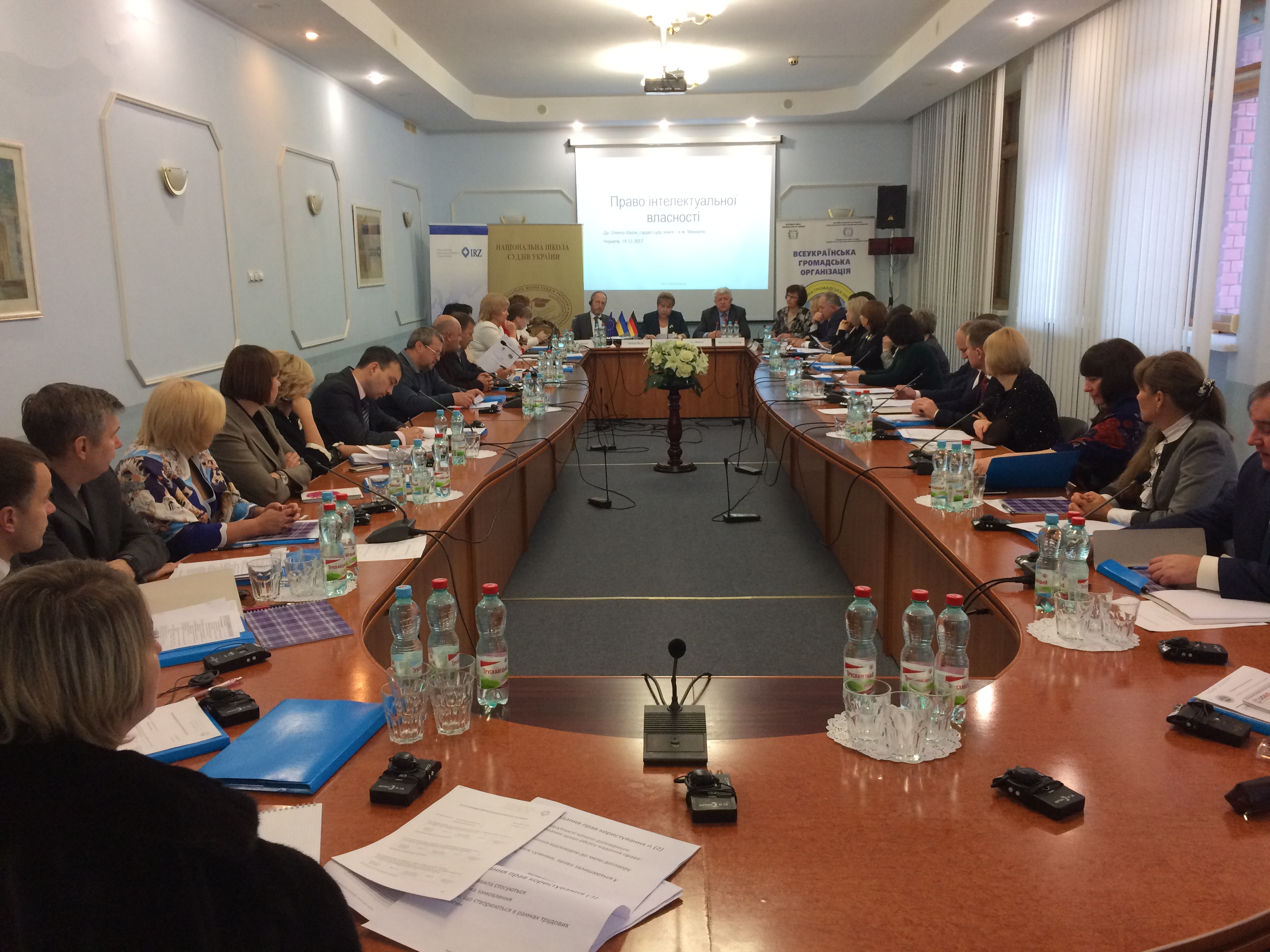Суддя Суду землі м. Мюнхен Др. Олівер Шьон та суддя Вищого суду землі м. Франкфурт-на-Майні Др. Уте Мокель ознайомили українських колег з основами німецької правової системи захисту інтелектуальної власності; сутністю, особливостями виникнення та передачі авторських прав згідно з німецьким законодавством. Зокрема, Др. Олівер Шьон звернув увагу на високу спеціалізацію судів у Німеччині, що оптимізує розгляд конкретних категорій справ та сприяє утворенню сталої судової практики. Він зазначив, що розгляд справи про захист права інтелектуальної власності є досить тривалим та може становити від 8 до 12 місяців з моменту відкриття провадження у справі. Крім того, як не дивно, при розгляді відповідних категорій справ німецькі судді вкрай рідко звертаються за допомогою до судових експертів.